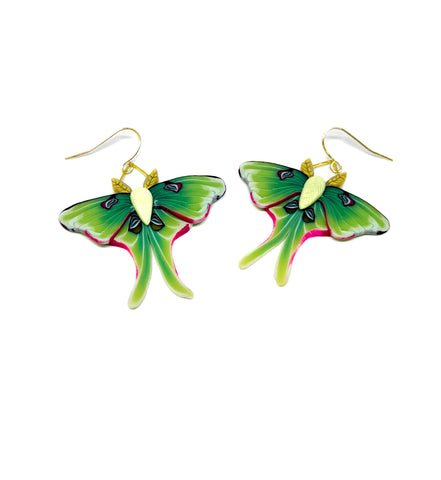 The large moths are hung from gold plated stainless steel ear hooks and each are approximately 2 inches long.