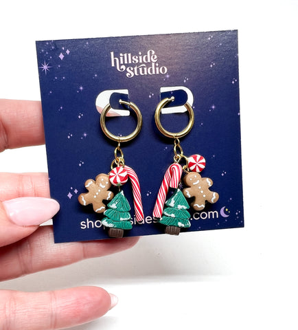 Each little Christmas miniature is handmade from polymer clay and hung on gold-plated huggies. Includes Candy canes, peppermint candies, gingerbread men, and snowy trees.