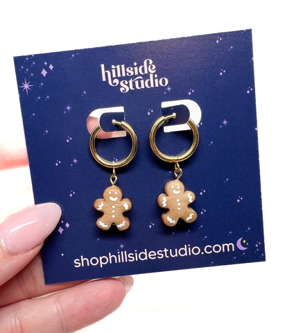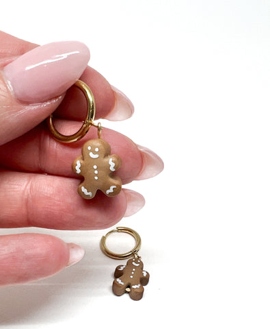 Each tiny gingerbread man is handmade from polymer clay and hung on gold-plated or rhodium-plated huggies.