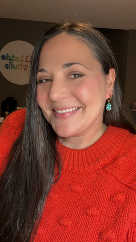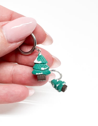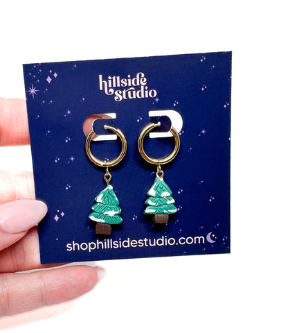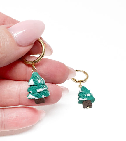 Each tiny snow covered tree is handmade from polymer clay and hung on gold-plated or rhodium-plated huggies.