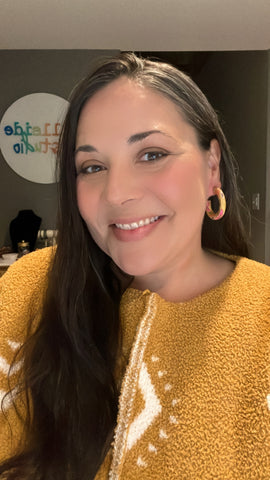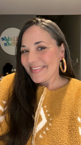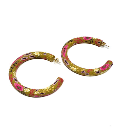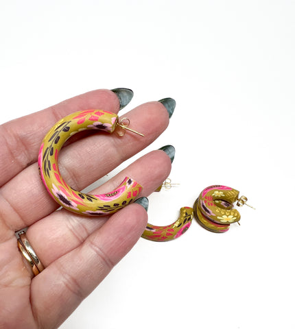 Polymer Clay hoops are decorated with an intricate cane design. They are attached to stainless steel posts and backs. Itty Bitties are just under 1 inch in diameter, Smalls are approximately 1.5 inches in diameter, and Large are approximately 2.5 inches in diameter.