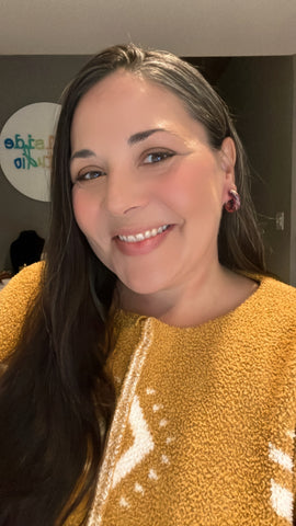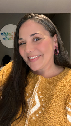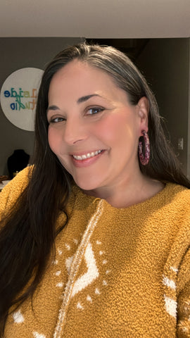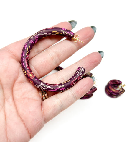 Polymer Clay hoops are decorated with an intricate cane design. They are attached to stainless steel posts and backs. Itty Bitties are just under 1 inch in diameter, Smalls are approximately 1.5 inches in diameter, and Large are approximately 2.5 inches in diameter.