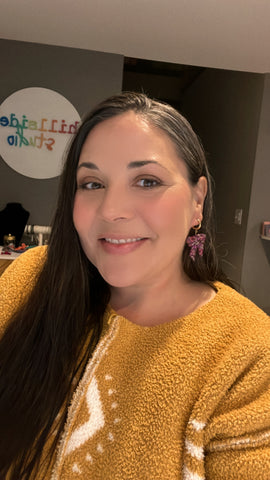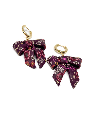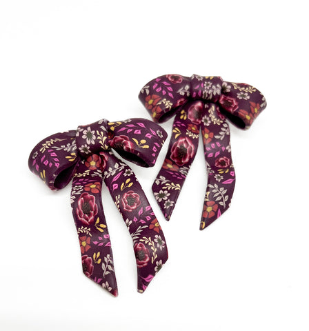 The intricate pattern is handcrafted with polymer clay canes.  The shapes are cut and assembled into bows! Gold-plated stainless steel posts are embedded into the back of the large earrings. The small are hung from a gold plated stainless steel huggie hoop. The large size is approximately 1.75 x 2.25  inches, and the small size is approximately 1.25 x 1.25 inches