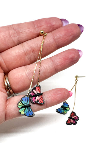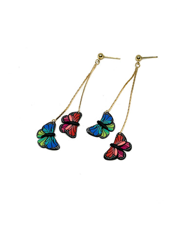 Two tiny butterflies are are hung from high quality gold plated chain and attached to gold-plated ball posts. The earrings hang approximately 3 inches.