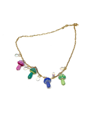Each handmade mushroom charm is arranged and hung on an 18 inch 18K gold-filled paper clip chain with Czech glass beads.