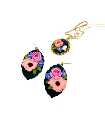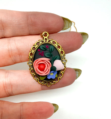 Gold-plated stainless steel chain with handmade clay floral pendant in a filigree frame.