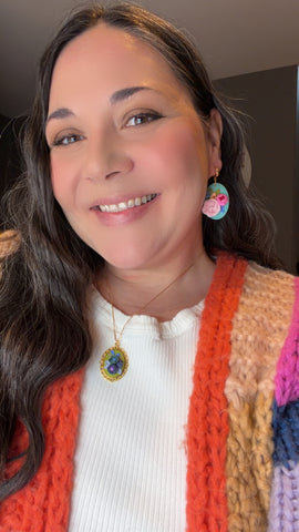 Gold-plated stainless steel chain with handmade clay floral pendant in a filigree frame.