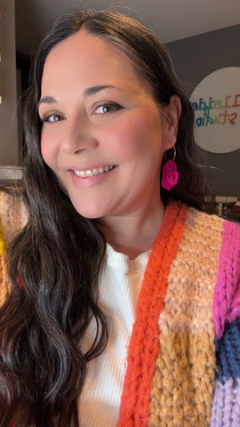 Polymer Clay flowers are sculpted by hand and placed on a frame shape, then hung from gold-plated stainless steel hoops. Earrings are approximately 2.5 inches long.