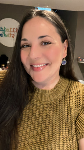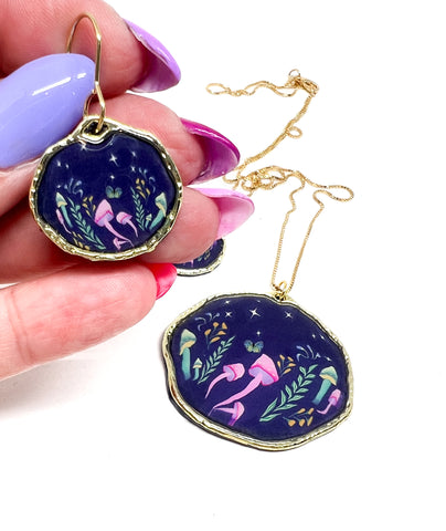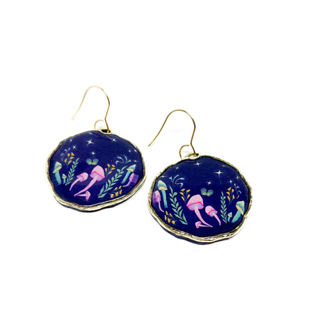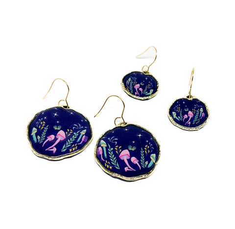 The Enchanted Mushroom pattern is entirely handmade from polymer clay canes and placed in a textured gold bezel then coated with glossy resin. Available in two sizes.