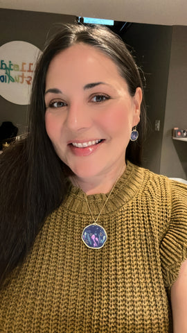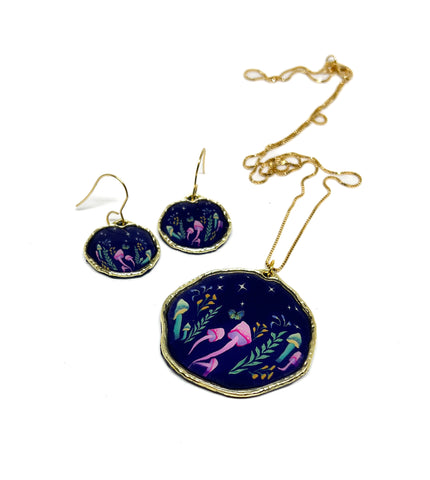 The Enchanted Mushroom pattern is entirely handmade from polymer clay canes and placed in a textured gold bezel then coated with glossy resin. Pendant is hung on a 20” non-tarnish gold-plated box chain.