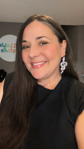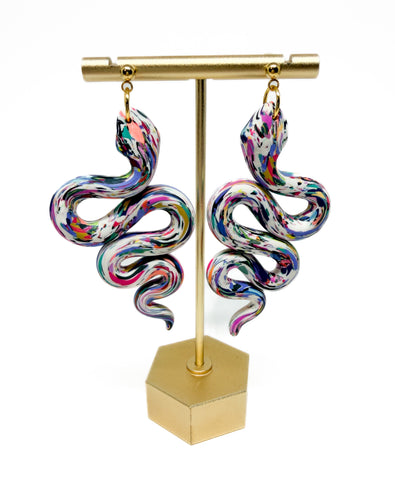 Polymer clay snakes decorated with a colorful scrappy cane and hung from a gold plated ball post. Snakes are approximately 3.5 inches long.