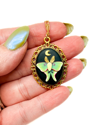 Gold-plated stainless steel chain with a handmade clay luna moth pendant in a filigree frame. Chain is 18 inches in length with a 2 inch extender.